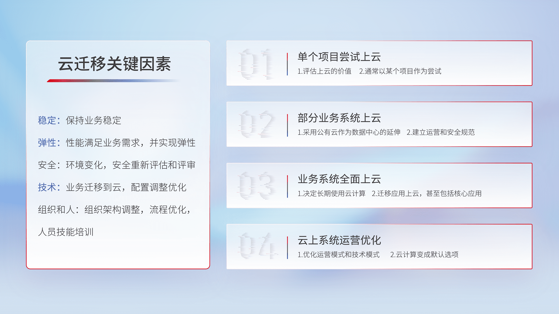 结合实际业务,,,从规划设计、、云平台选型、、、、云原生改造、、、、数据迁移、、集成交付,,,迁移全过程为客户识别最佳上云路径,,做好风险识别管理,,,设计网络架构、、、、身份权限、、安全审计合规、、操作审计、、、日志审计、、监控告警策略、、、多站点容灾设计等,,对云上基础设施进行整体规划,,,提升IT治理水平,,,,以满足弹性、、、高可用、、、、高性能的需求。。。