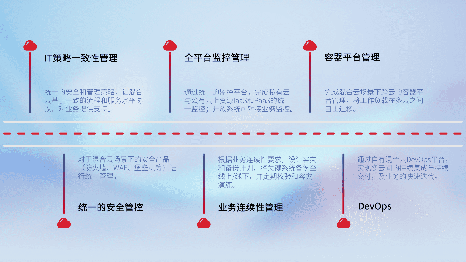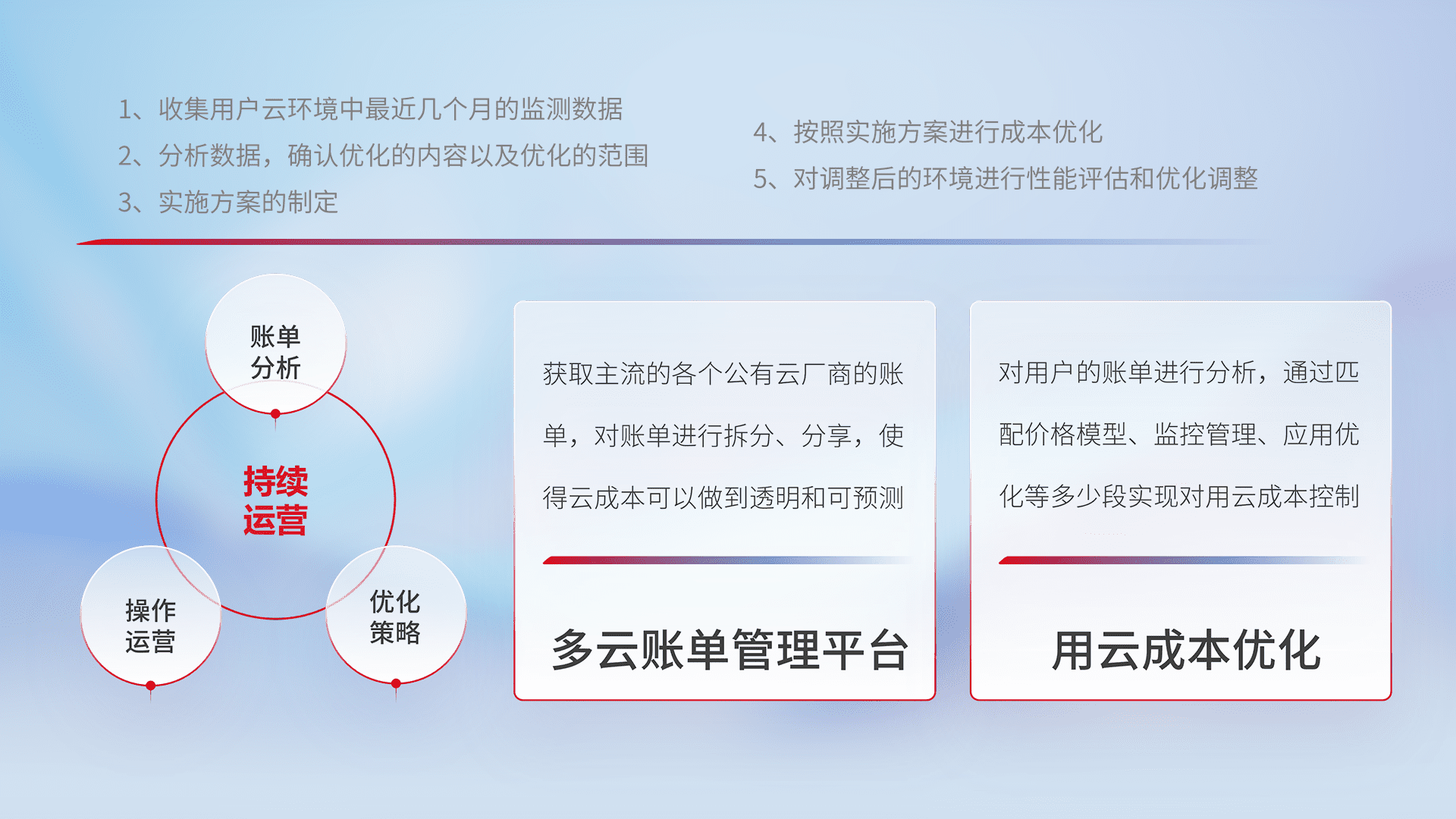 通过多云纳管,,,,以统一的资源数据模型把客户的云资源进行抽象和封装,,,进而实现对多云资源的统一操作,,,保障云资源管理的可靠性、、、稳定性与可用性。。。。量身定制化运维内容,,,配置、、、、开发运维、、、补丁管理、、、、备份、、监控、、、认证和访问管理、、、、审计和日常巡检等,,,,保障在用云过程中的可靠度,,稳定度以及高可用率。。。