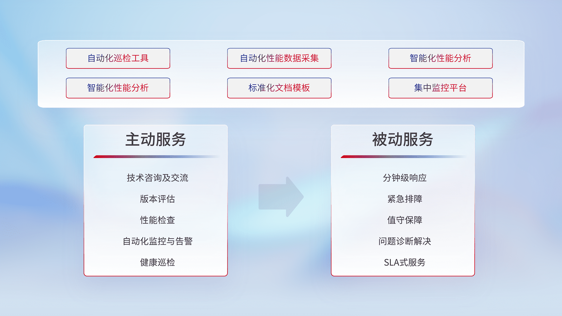 智能化工具和标准化文档,,,,保障服务质量,,,提供主动服务(包含技术咨询、、、、版本评估、、性能检查、、自动化监控与告警、、、、健康巡检)和被动服务包含(分钟级响应、、、紧急排障、、、、值守保障、、、、问题诊断解决、、、、SLA服务)。。
