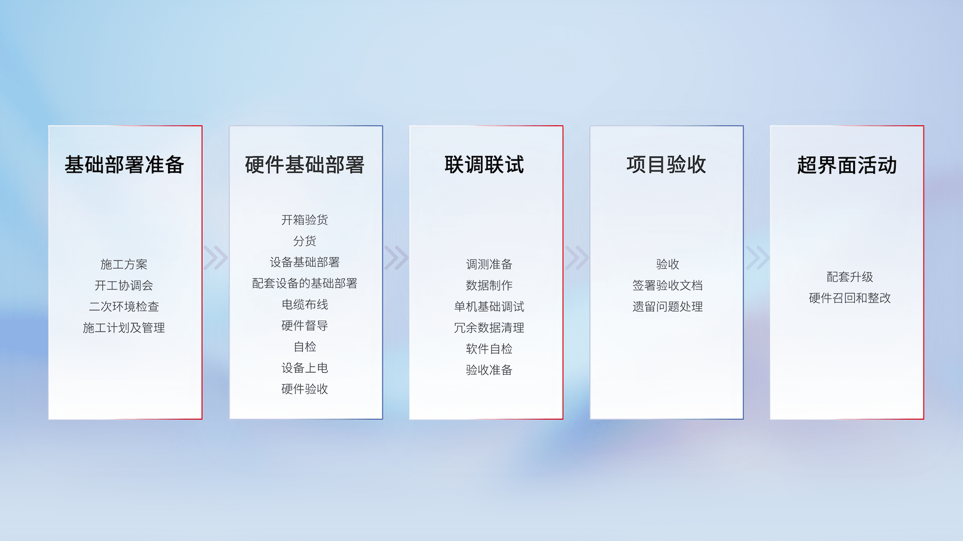 从基础部署准备、、、、硬件基础部署、、、联调联试、、、项目验收、、越界面活动的全过程可追溯,,,保证施工质量和进度。。。